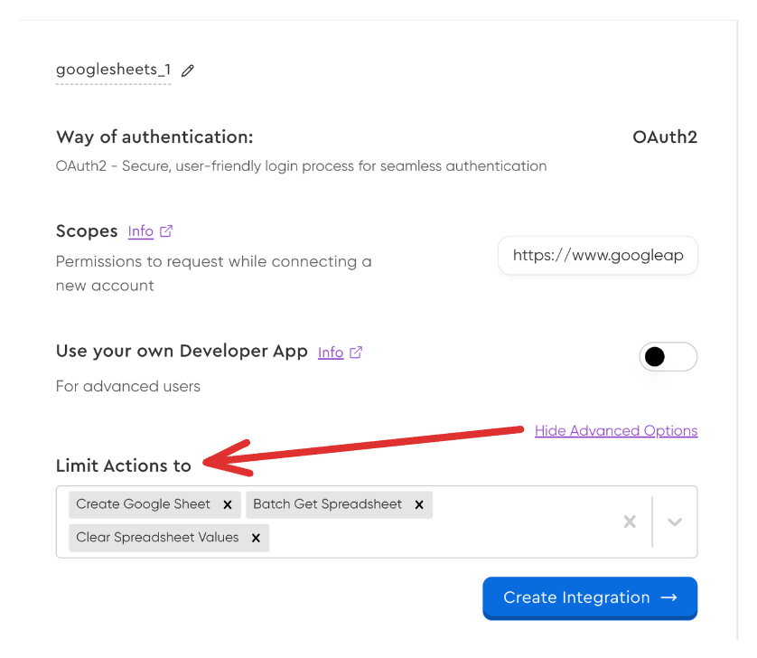- You typically create an Integration once per app, per environment (e.g., one for development, one for production).