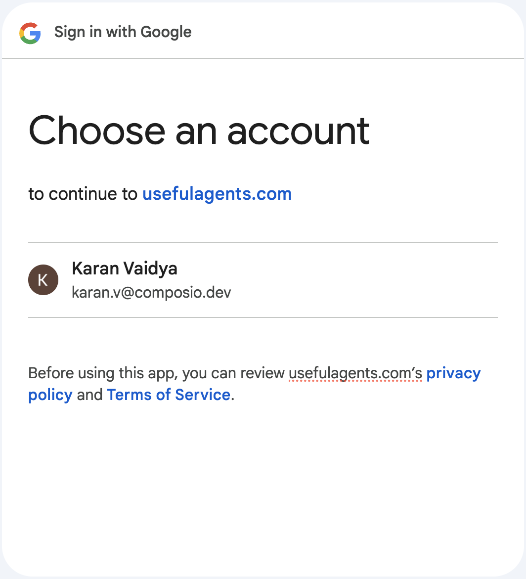 The connection request returns a redirect URL that you can emit to the user to start the auth process. They see the custom consent screen that you configured. In this case, it’s “usefulagents.com”